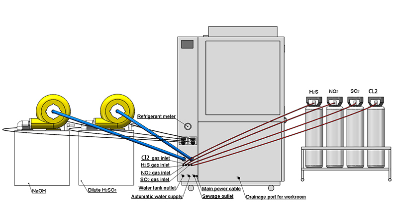 Die Betreiber legen die Ziel gas konzentrationen fest (z. g., h2S 100 ppb, SO2 150 ppb, NO2 200 ppb, Cl2 50 ppb), Temperatur (40 ° C) und relative Luft feuchtigkeit (85% RH). MFCs injizieren Gase kontinuierlich mit Mikrogramm-Genauigkeit, während interne Ventilatoren die Luft zirkulieren lassen und eine gleichmäßige Exposition aller Proben erreichen. Diese Präzision stellt sicher, dass die beschleunigte Korrosion kontrolliert und vorhersehbar forts ch reitet.